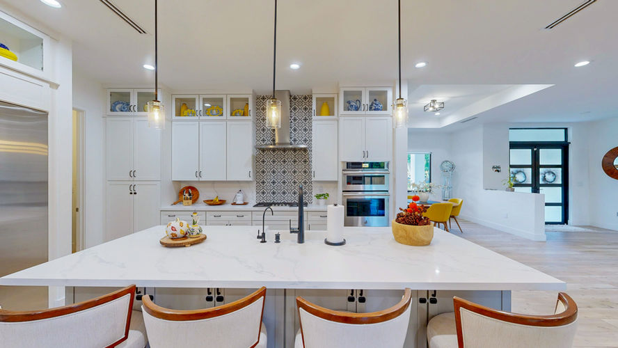 Cocina gourmet con isla central, electrodomésticos JennAir & topes de cuarzo